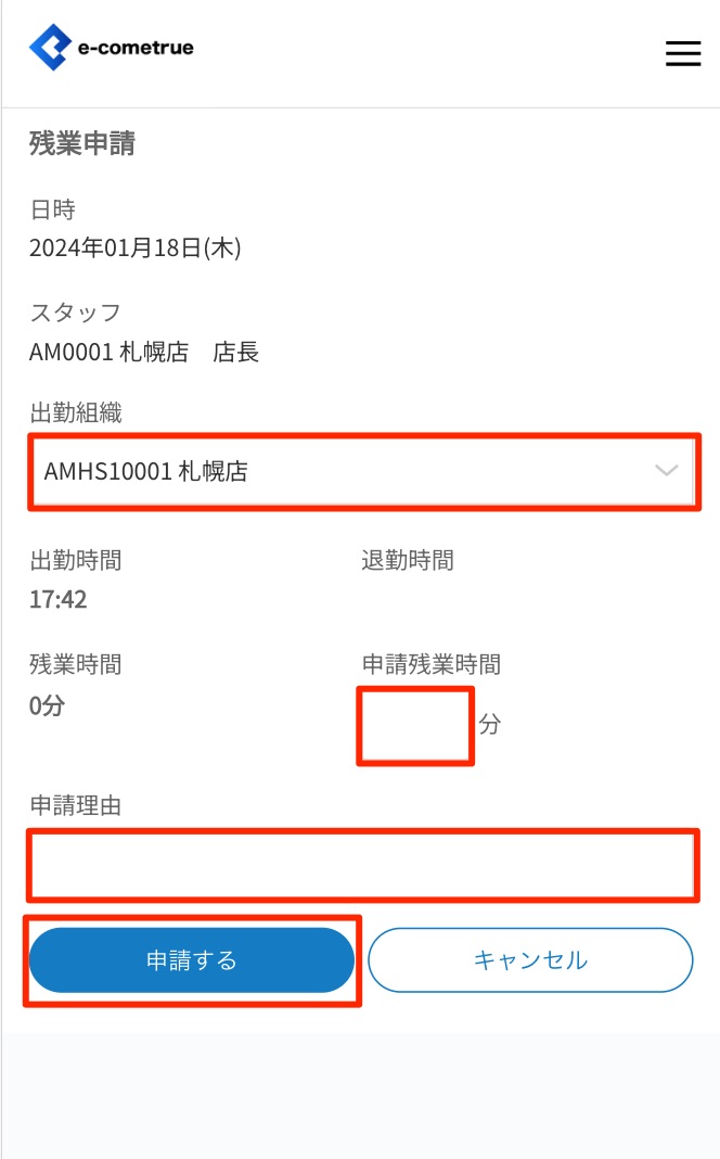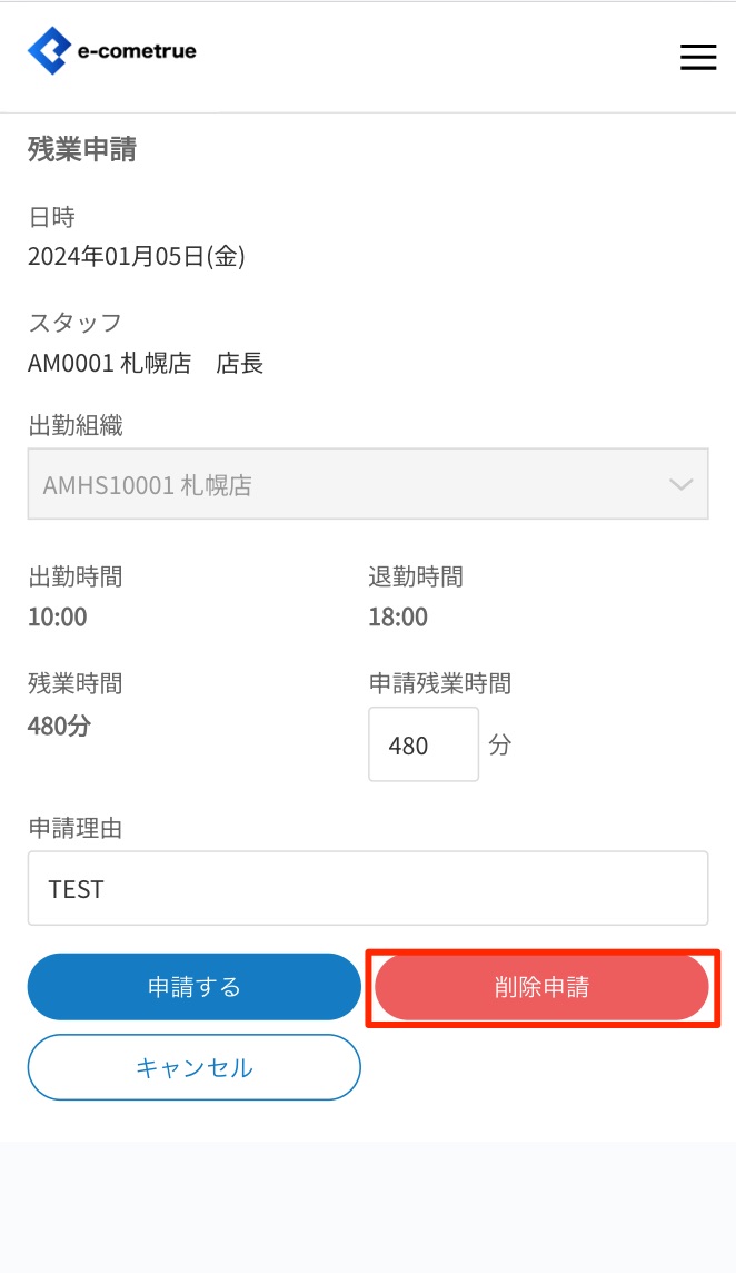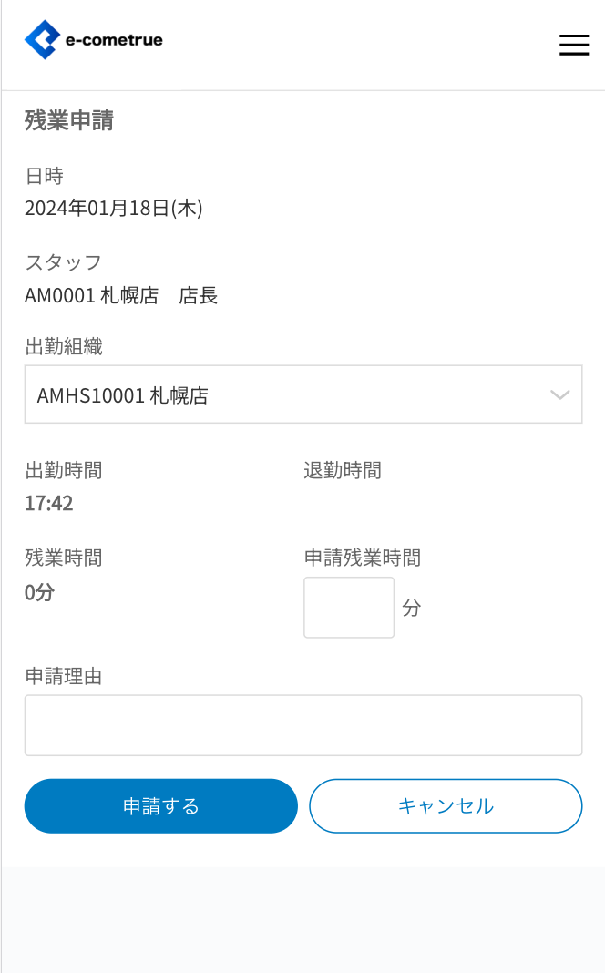 残業時間を申請することができ、また申請のキャンセルが行えます。